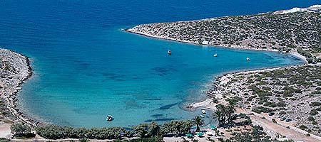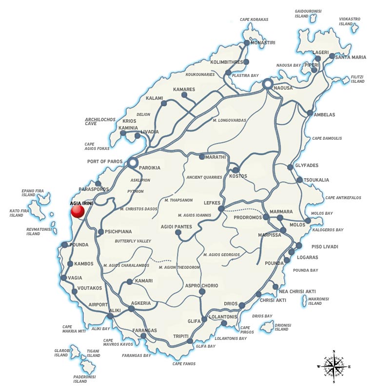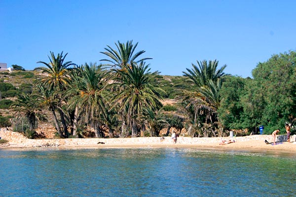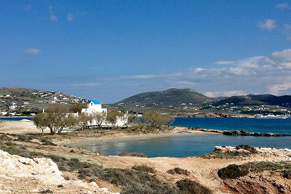 Agia Irini beach lies 4 kms south of Paroikia and it is named after the little church dedicated to the saint of the same name located on the right of the beach. It actually consists of two consecutive sandy beaches separated by a few rocks, with palm trees providing rich shade and an exotic landscape. Its waters are crystal clear and the seabed is ideal for snorkelling; therefore popular with the fans of this sport.