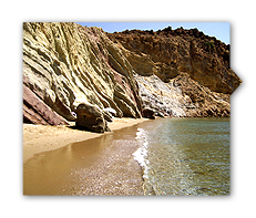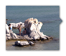 On the right of Molos there is the Kalogeros beach with its raw beauty and the superb colours due to the deposits of clay, well known ever since antiquity for its therapeutic qualities. One end of the beach is marked by a tall rock, where the legend has it that a monk committed suicide; hence the name of the beach (kalogeros = monk). On the left of Molos two other beaches, Tsoukalia and Glyfades, are well known meeting points for windsurfers every summer.