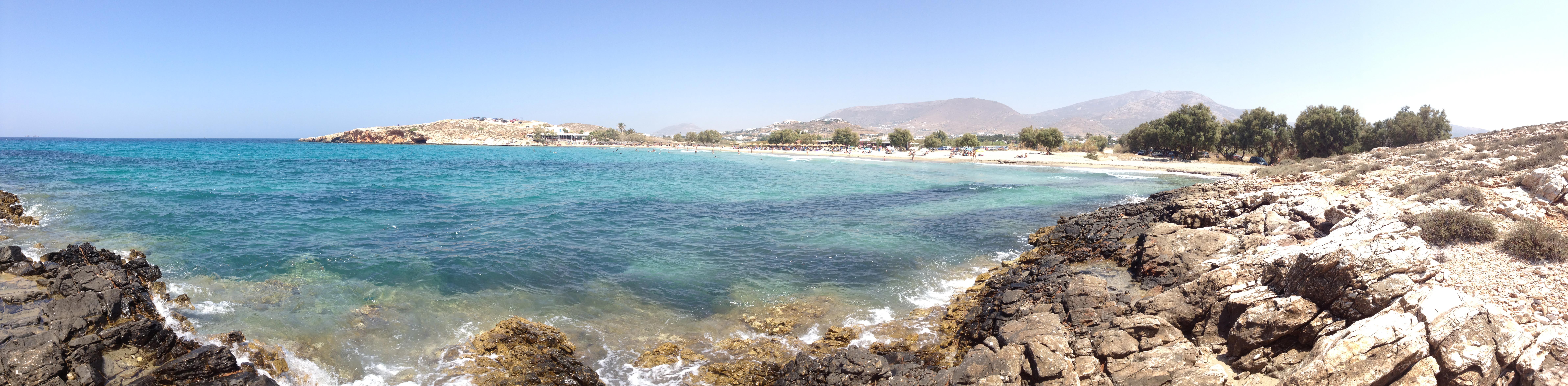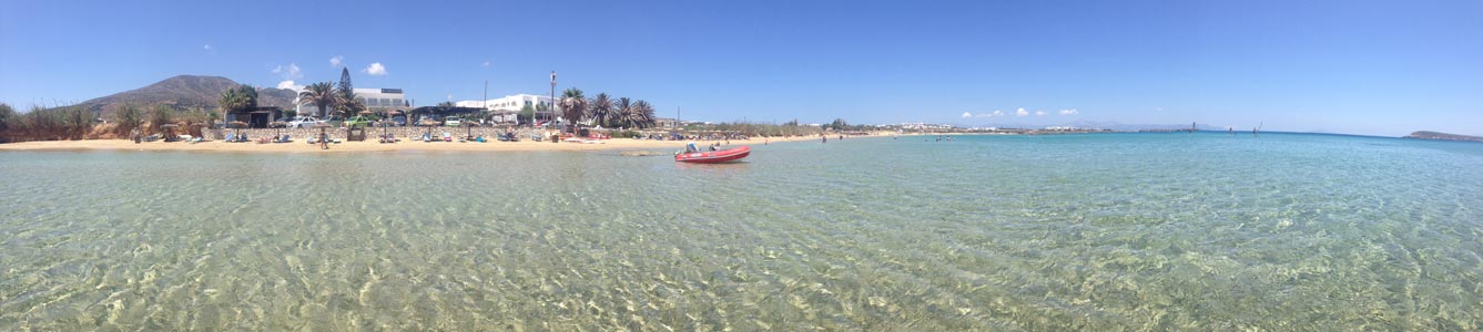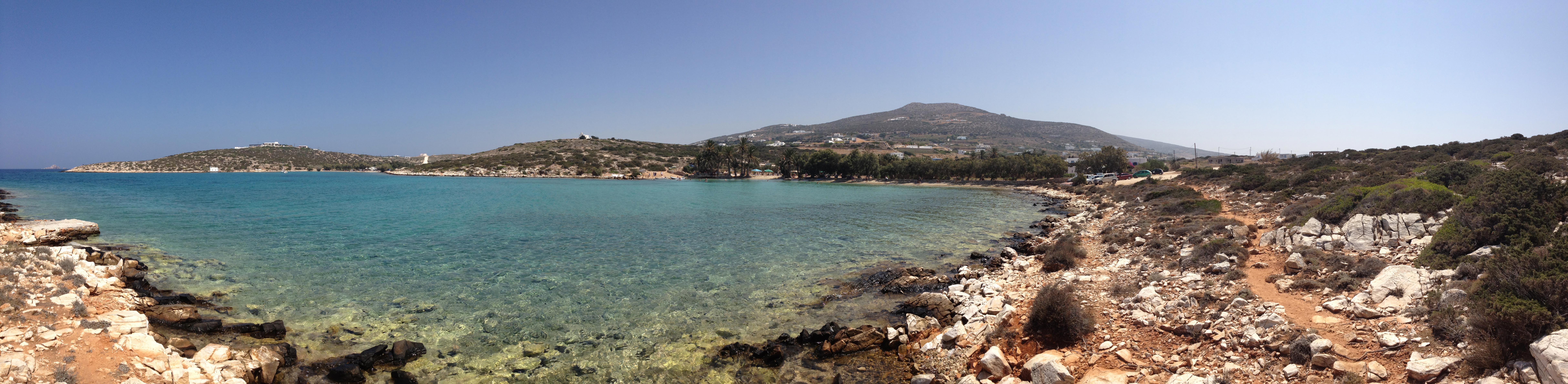 Parasporos beach is extensive and sandy, with clear water, about 2.5 kms south of Paroikia. It is extremely popular, especially to young people, partly organized, and with quite a few bars and tavernas all around. The part of the beach that is not organized is free to be used by those who are not interested in the amenities of a sophisticated infrastructure and just wish to enjoy the sun and the sea. Characteristic features of the landscape are the rocks on the two ends of the beach and the salt cedar trees.