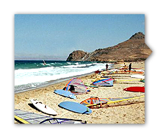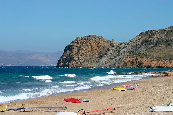 New Golden Beach, a long stretch of sand called by the locals Tserdakia, is located about 26 kms southeast of Paroikia and is the natural extension of Golden Beach. It has been awarded the Blue Flag distinction and is world renowned as one of the ideal beaches in the Mediterranean for sea sports, and in particular windsurfing. In the '90s New Golden Beach was established as the ideal place for organizing the annual world championship windsurfing competition, which takes place in the beginning of August. The beach is very well organized and its infrastructure includes all kinds of accommodation, as well as a well equipped surf club (rental and storing of surf boards, rescue craft, lessons for beginners and advanced surfers). On the beach and in the wider area there is a variety of lodgings and seaside tavernas with good food.