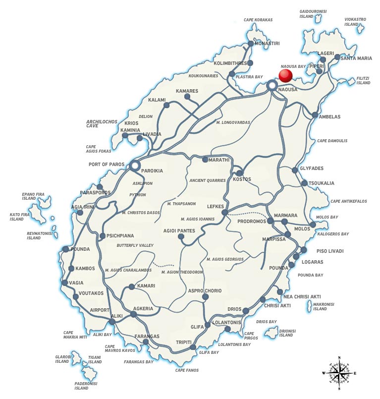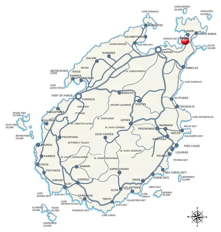 The small sandy lovely Piperi beach is located about 10 kms northeast of Paroikia, a few hundred meters before Naoussa. Some locals differentiate between Big (Megalo) and Small (Mikro) Piperi, but in fact it is a continuous, beautiful beach with shiny sand and crystal clear water. Both the beach itself and the surrounding area can offer adequate lodging facilities. Also, there are fish tavernas and traditional restaurants serving fresh fish and good food, as well as numerous bars, cafés with or without music, most of them though with a fantastic view of the town and of the sea.