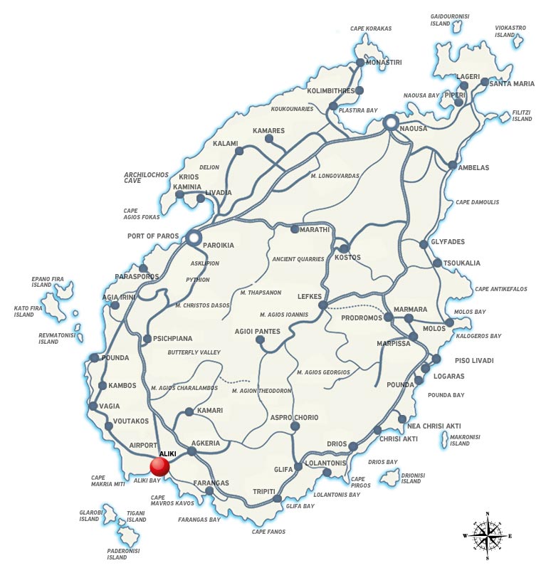 On the road Alyki – Pounta, 2 kms beyond the airport, there is a beach protected from the wind, with coarse sand and crystal clear water, a beach ideal for families. Access is easy, as the road is asphalt-paved for the most part and only the last 500 m. are a walkable dirt road.