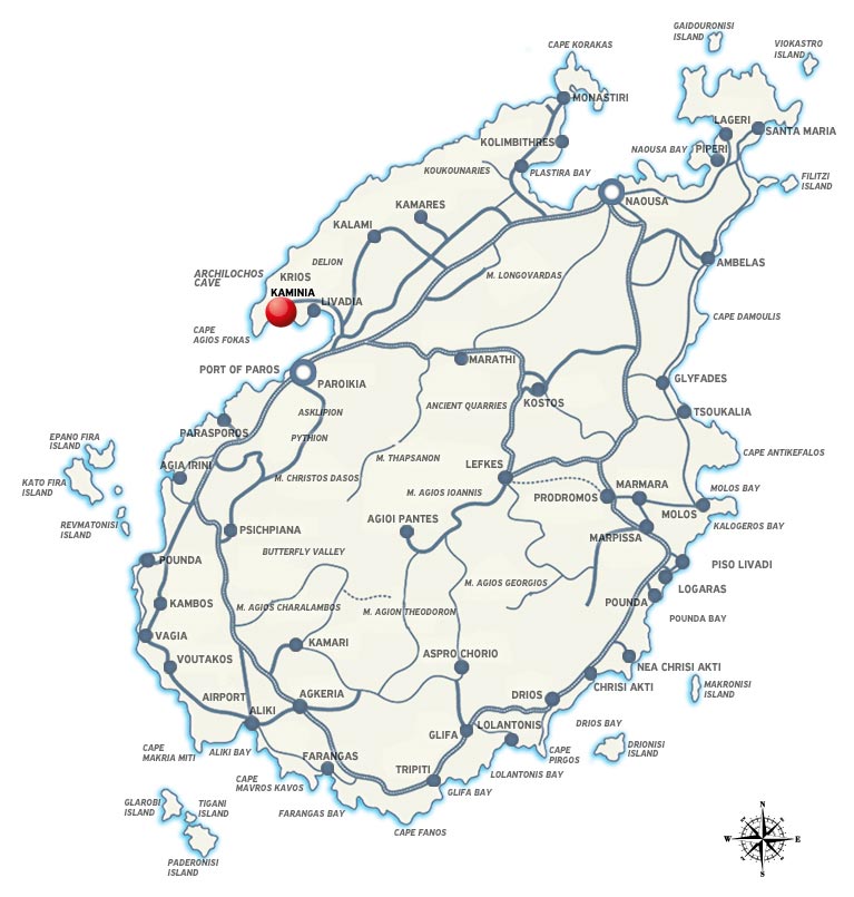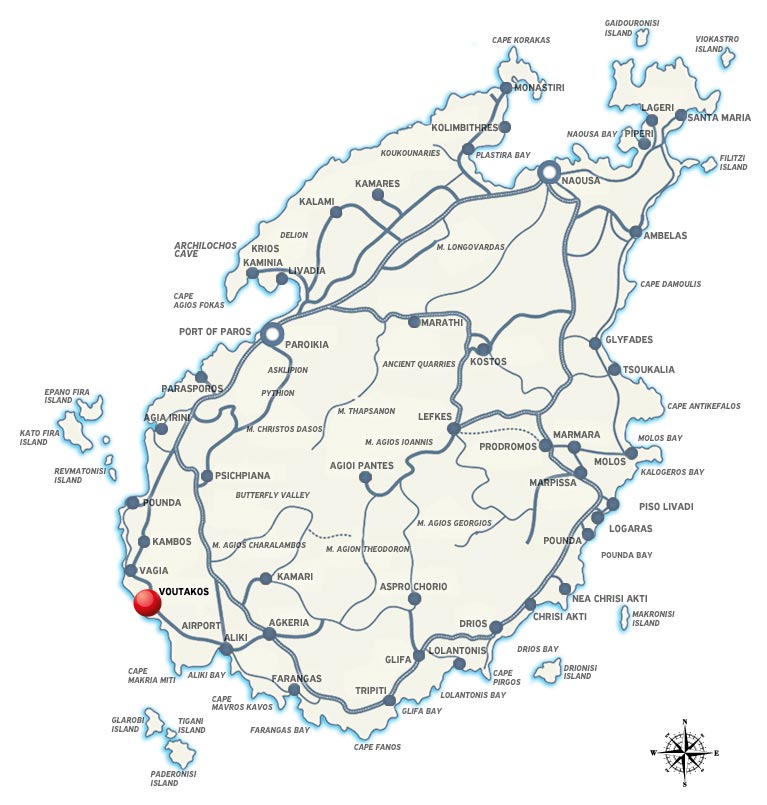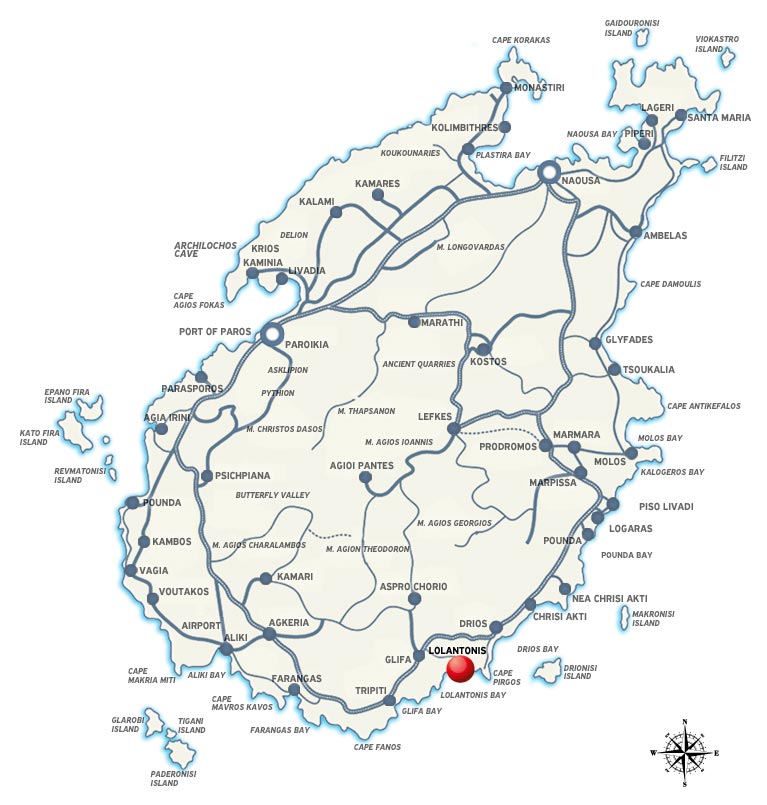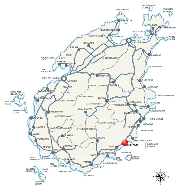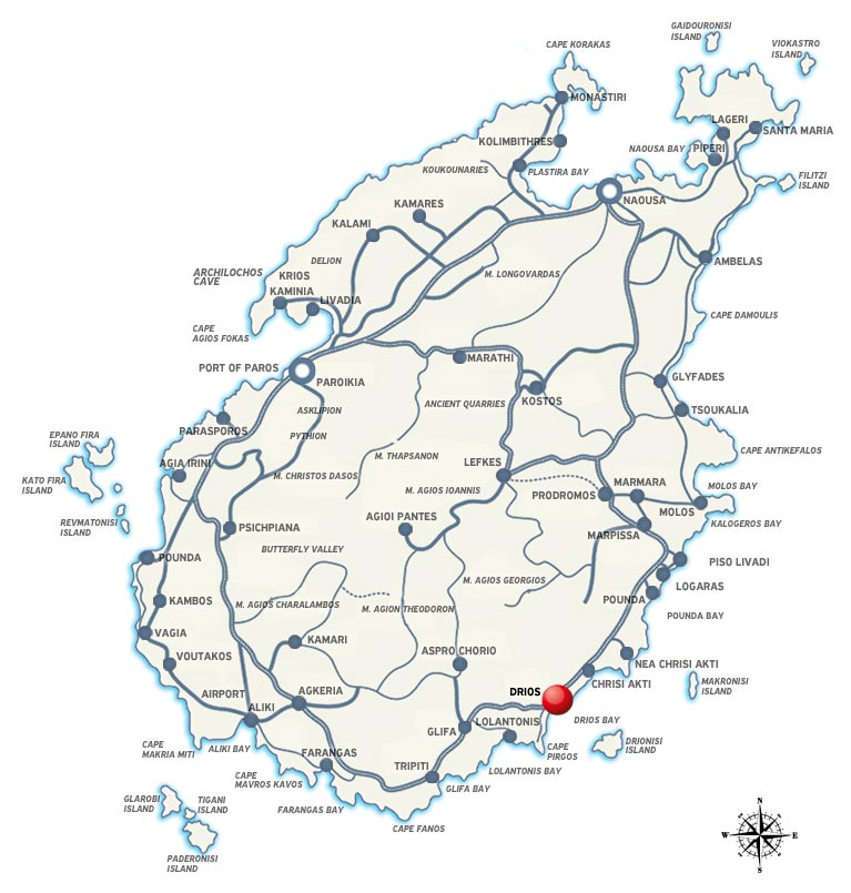 It may sound strange that on a Cycladic island one can find rich vegetation; however, the idyllic village of Drios, 20 kms south of Paroikia, harmoniously combines blue and green. The scenic beach in front of the small idyllic village is not affected by the strong northern summer winds, and in fact a small harbour has been constructed for fishing boats and small tourist craft.