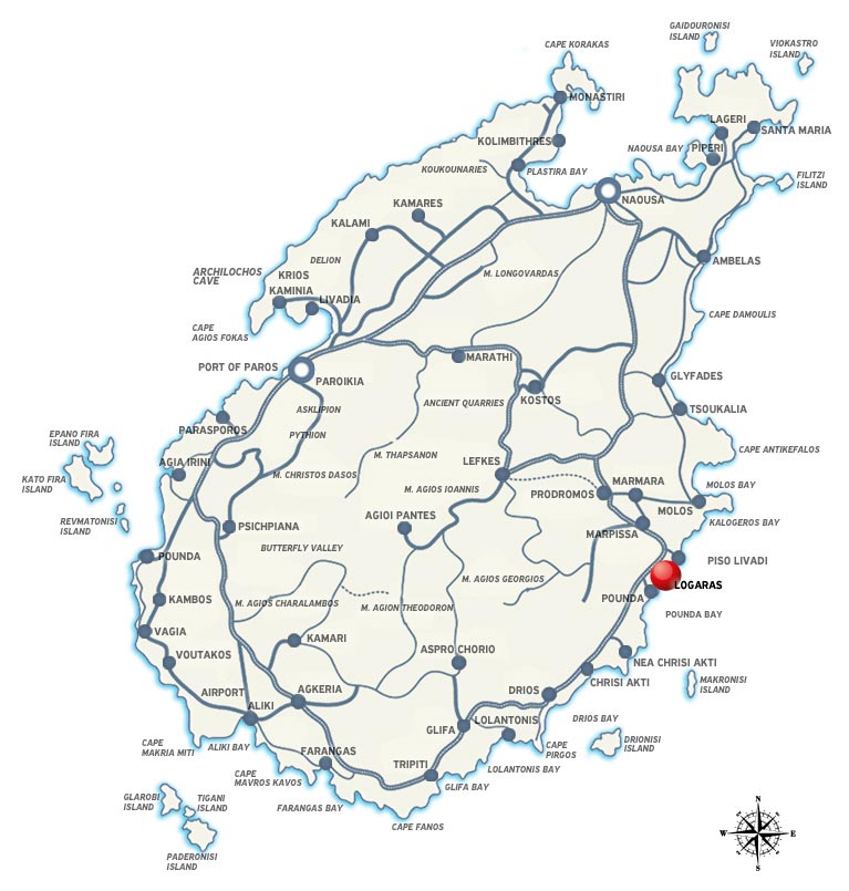 Almost next to Piso Livadi there is the Logaras beach, about 17.5 kms southeast of Paroikia. It has been awarded the Blue Flag distinction and it is located in front of the tourist and vacation resort of the same name, it is ideal for swimming, snorkelling, and all sea sports. There are many options as regards lodging in the area, while on the beach itself and in particular its fish tavernas you can enjoy fresh fish and the famous parian cuisine. Also, there are cafés and bars next to the sea.