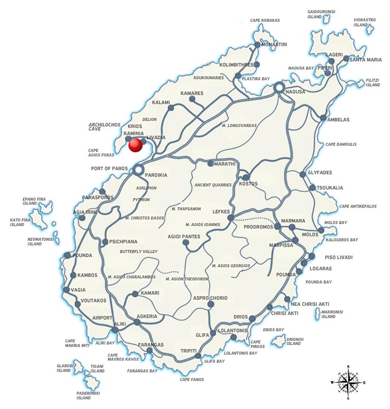 Livadia beach is located at less than 1 km from the center of Paroikia, north of the port. It is a well organized, extended beach with white sand and clean water, popular and quite crowded. Along the coast there are all kinds of shops. One can engage in sea sports and all those who enjoy pastimes in the sea or on the beach will find the perfect place for it.