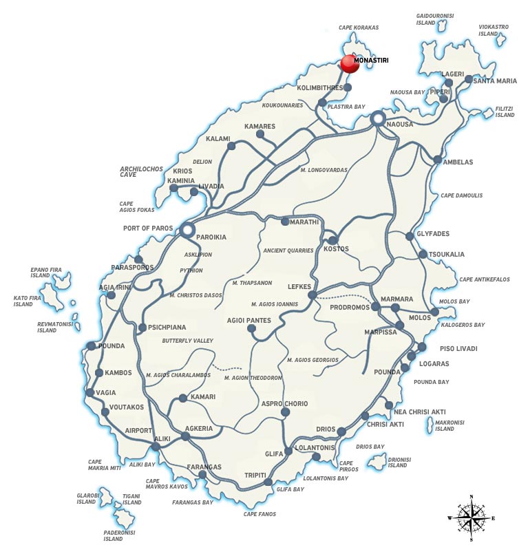 Monastiri beach is ideal for those who wish to swim and sunbathe naked or topless. Lodging is available in the wider area, in close by Kolymbithres and in Naoussa, and the seaside fish tavernas serve good food. The beach bars attract mostly young people who come here to enjoy the sea, the sun, the music, the parties, various happenings and other pastimes. On the right side of the beach there is the Monastery of Agios Ioannis, where festivities take place each year on August 29th.