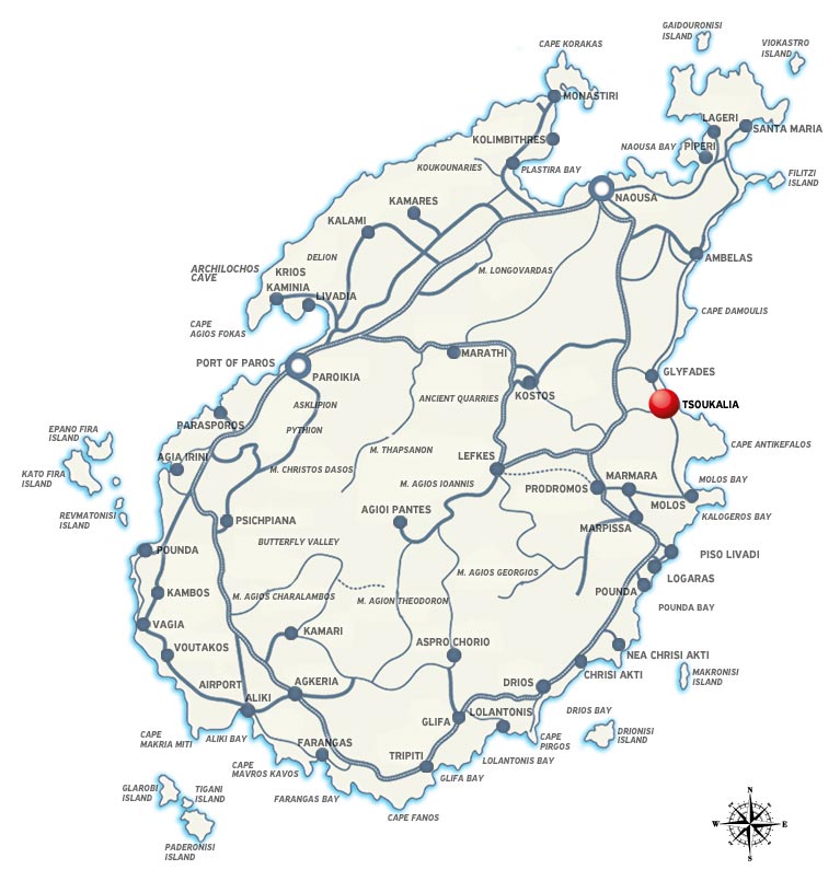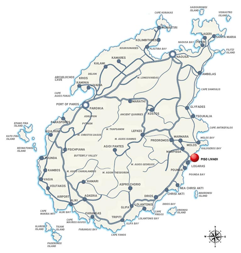 Approximately 4 kms from Marpissa and 18 kms southeast of Paroikia, on the eastern part of the island, there is a picturesque little harbour, Piso Livadi. During the summer months it connects Paros to other islands (Naxos, Ios, Santorini, Amorgos, Mykonos, Delos, Antiparos and Koufonissia). The visitor can enjoy swimming in its clear blue water and sunbathing in a calm and serene environment stretched out on its golden sand or in the shade of the salt cedar trees. The beach itself, the village and the surrounding area can offer adequate lodging facilities, while the seaside fish tavernas and restaurants serve fish and delightful dishes with local produce. The church of Agios Georgios Thalassitis (Saint George of the Sea) with its age-old frescoes is a point of attraction for visitors.