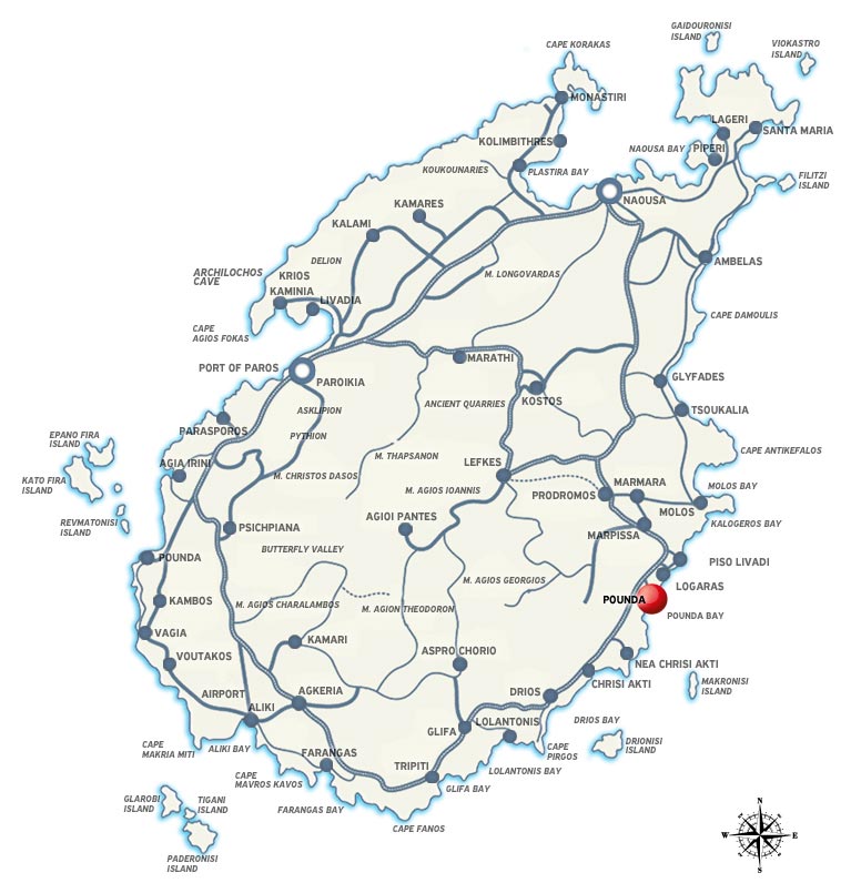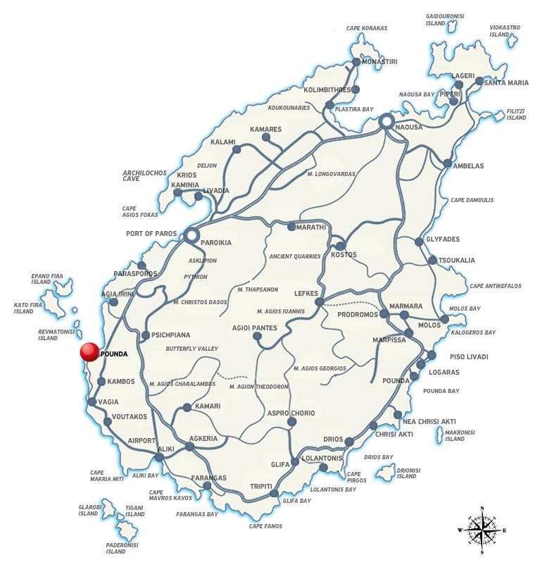 A series of beautiful small beaches in front of the vacation resort under the same name, 8 kms southwest of Paroikia. Pounta is located directly opposite Antiparos, which can be reached by ferry-boat covering the distance of only one nautical mile. The beach is organized and is best suited for sea sports, such as windsurfing and kitesurfing. The area abounds in hotels, cafés, tavernas, surf clubs and there is also a diving school.