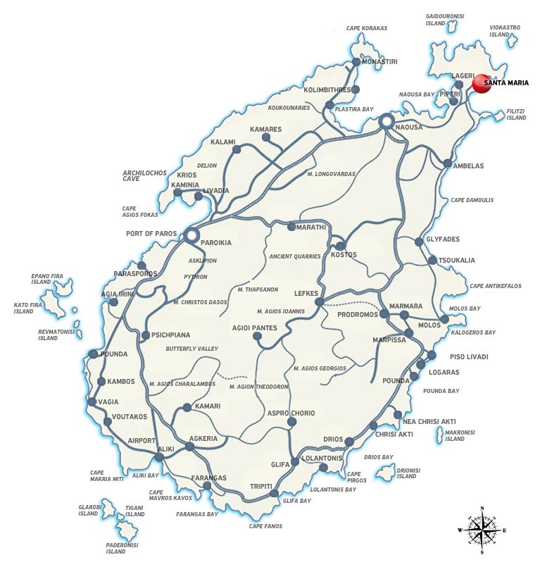 Santa Maria beach, 2 kms from Naoussa and about 13 kms northeast of Paroikia, is a large sandy stretch with pristine water. In the surrounding area one can find good lodgings and superb food served at the seaside tavernas and other restaurants in the area. Santa Maria beach is organized, but it is not so crowded, a fact that renders it ideal for those who are looking for a beautiful, nice and at the same time tranquil beach. The place is frequented by numerous windsurfing fans, and in particular those specializing in wave and enjoying the thrill this sea sport can generate. Finally, for those who love the seabed, but do not fish, there is a diving school to help them witness up close the beauty of the sea under the surface.
